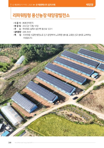 신·재생에너지가이드 2025 ▶ 신·재생에너지 설치사례 태양광 리파워링형 용산농장 태양광발전소 •시 공 사 : ㈜호연이엔지 •완 공 일 : 2023년 10월 10일 •주 소 : 전라북도 김제시 금산면 용산로 123-1 •설비용량 : 498.3kW •특 징 : 리파워링 시공한 발전소로 장기 운영하여 노후화된 설비를 고효율 신규 설비로 교체하는 사업입니다. 268 New & Renewable Energy Guide 2025