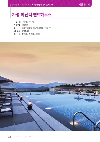 신·재생에너지가이드 2025 ▶ 신·재생에너지 설치사례 지열에너지 가평 아난티 펜트하우스 •시 공 사 : 공항시설관리㈜ •완 공 일 : 2015년 •주 소 : 경기도 가평군 설악면 유명로 1007-90 •설비용량 : 50RT=4대 •특 징 : 휴양시설 및 커뮤니티 등 362 New & Renewable Energy Guide 2025