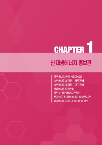 신·재생에너지 홍보관 CHAPTER CHAPTER1 1 한국에너지공단 NEXTAGE 녹색에너지체험관 - 광주전남 녹색에너지체험관 - 대구경북 서울에너지드림센터 영덕 신·재생에너지전시관 전라남도 신·재생에너지 홍보전시관 제주에너지공사 CFI에너지미래관