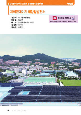 신·재생에너지가이드 2024 ▶ 신·재생에너지 설치사례 태양광 제이앤에이치 태양광발전소 •시 공 사 : (주)그랜드썬기술단 설치사례 홍보영상 •완 공 일 : 2023년 https://www.youtube.com/watch?v=OBnXyKSbfos •주 소 : 대구광역시 달서구 호산동 •설비용량 : 1.5MW •발 주 처 : 고려전선 290 New & Renewable Energy Guide 2024