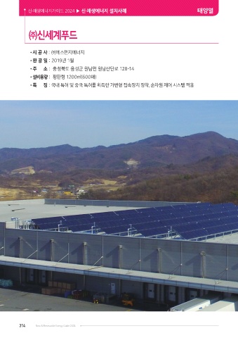 신·재생에너지가이드 2024 ▶ 신·재생에너지 설치사례 태양열 ㈜신세계푸드 •시 공 사 : ㈜에스앤지에너지 •완 공 일 : 2019년 1월 •주 소 : 충청북도 음성군 원남면 원남산단로 128-14 •설비용량 : 평판형 1200㎡(600매) •특 징 : 국내 특허 및 중국 특허를 획득한 가변형 접속장치 장착, 순차원 제어 시스템 적용 314 New & Renewable Energy Guide 2024